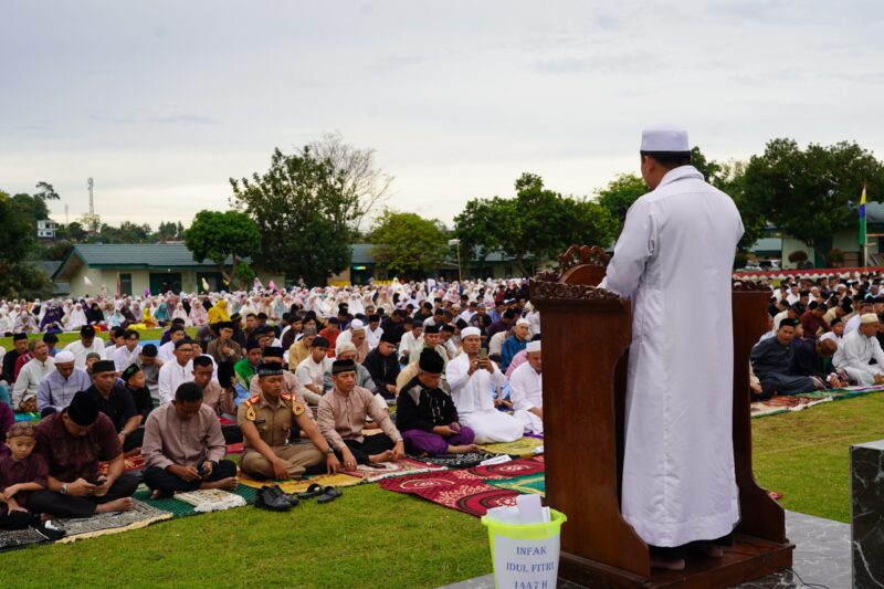 “Oleh sebab itu, beruntunglah kita di pagi hari ini, datang berduyun-duyun dari tempat tinggal kita, menuju tempat ini untuk menjalankan salat Idulfitri secara berjamaah. Kita bermunajat untuk mengetuk bilik-bilik rahmat-Nya Allah SWT. Pada hari Sabtu tanggal 1 Syawal 1447 Hijriyah ini, marilah kita tanamkan di dalam hati kita, bahwa ke depannya hidup kita akan menjadi lebih baik, “ujarnya.