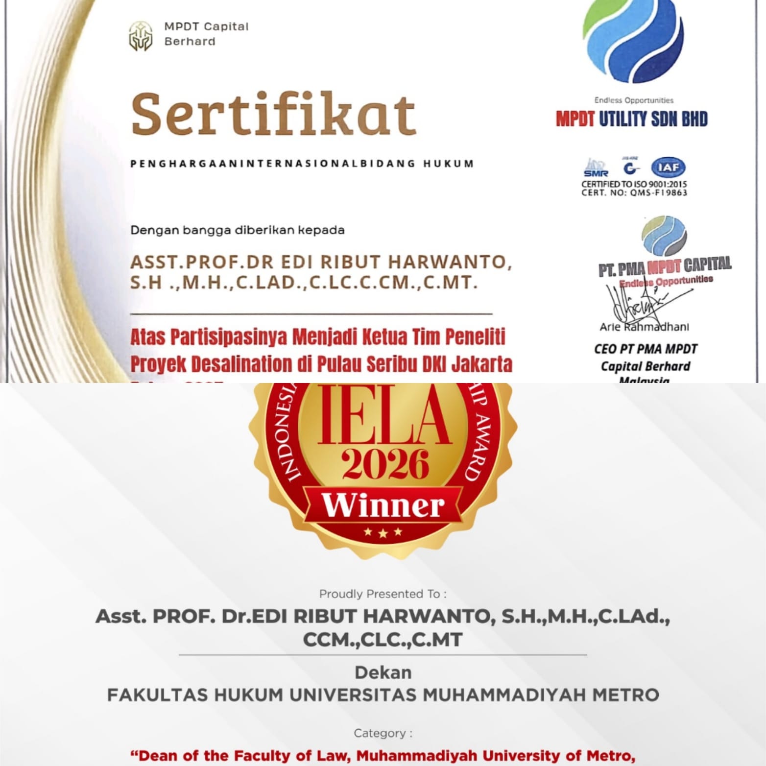 Dekan Fakultas Hukum Universitas Muhammadiyah Metro Asst. Prof. Dr. Edi Ribut Harwanto, S.H., M.M., C.LAd., C.LC., C.CM., C.MT, mendapatkan Internationally Awarded Certificate in The Fiel Of Law dari perusahaan korporasi terkemuka di Malaysia MPDT Capital Berhad. Penghargaan di berikan oleh perusahaan atas jasa dan dedikasinya sebagai ketua Tim Peneliti atas Kajian Hukum Proyek Desalination di Pula Seribu Provinsi DKI Jakarta tahun 2025. Penghargaan akademi dari Chief Exutive Officer MPDT Capital Barhad Malaysia Dato DR. Nik Zamri Majid, melalui CEO PT PMA MPDT Capital Berhad di The City Tower Lt 12 Unit 1 N jalan MH Thamrin N0.81 Jakarta Pusat-DKI Jakarta Senin (9/2/2026) lalu.