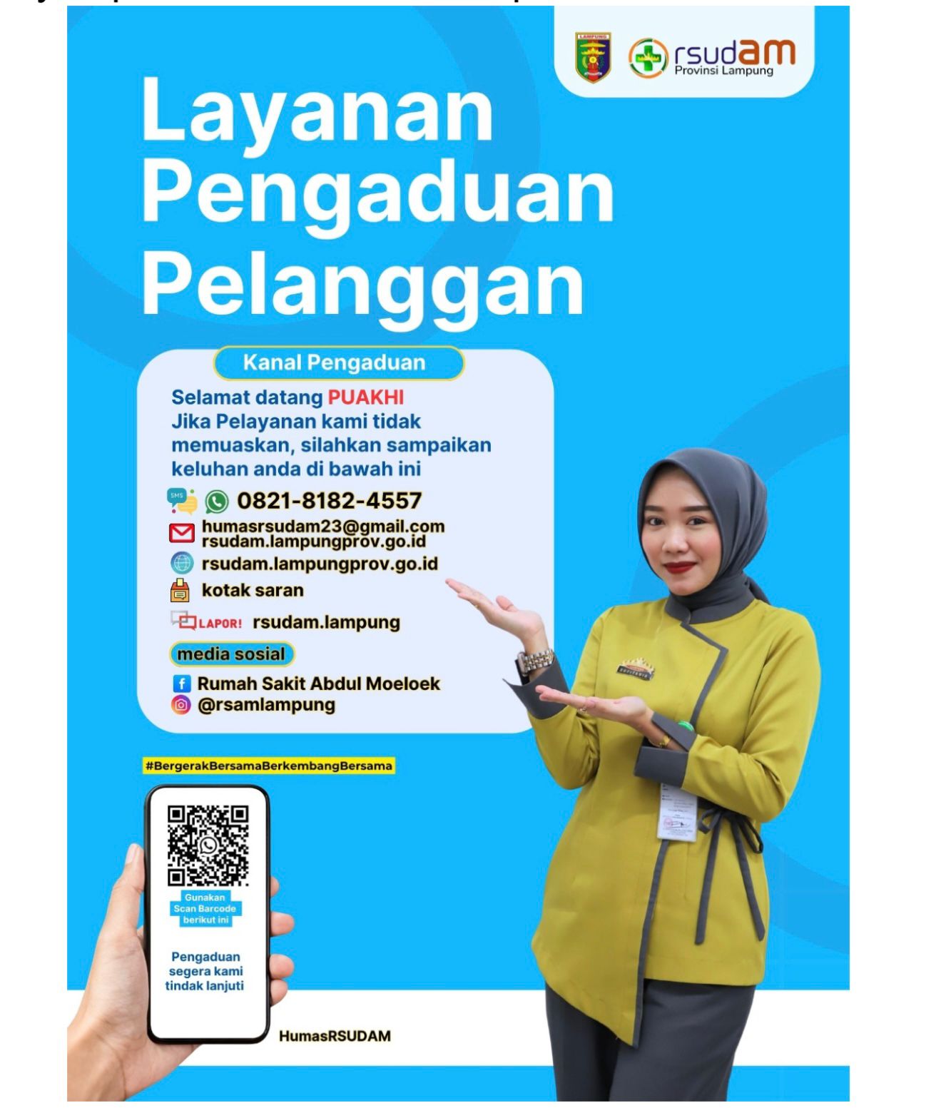 “Kami berkomitmen memberikan pelayanan kesehatan terbaik dan terus meningkatkan kualitas layanan, fasilitas, serta kompetensi tenaga medis. Kami juga membuka ruang bagi masyarakat untuk menyampaikan keluhan dan aspirasi melalui kanal resmi RSUD Abdoel Moeloek,” pungkas Desy. (Red/*)