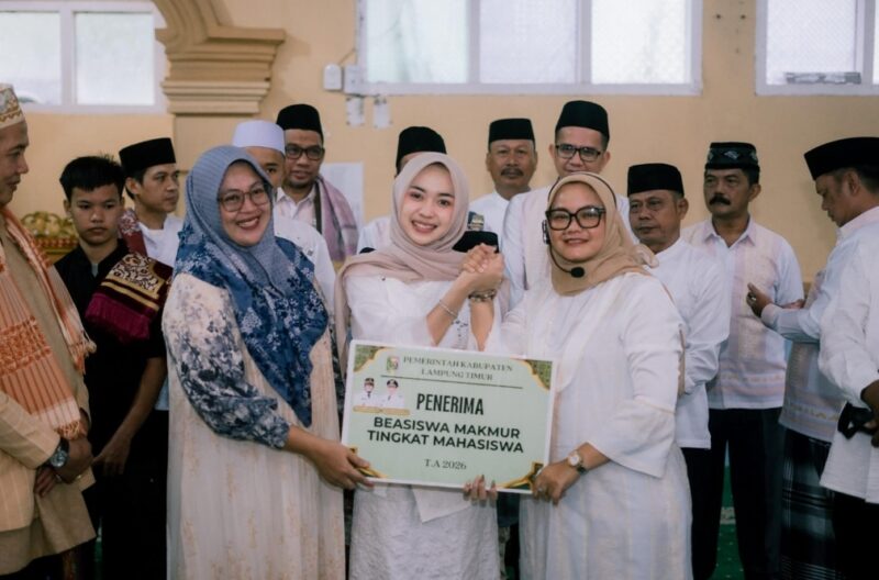 Bupati Lampung Timur Ela Siti Nuryamah menyerahkan Beasiswa Makmur tingkat mahasiswa kepada Intan Putri Lestari, juara ajang Kontes Dangdut Indonesia 2026. Bantuan tersebut diberikan sebagai bentuk dukungan terhadap generasi muda berprestasi sekaligus mendorong akses pendidikan tinggi di daerah.