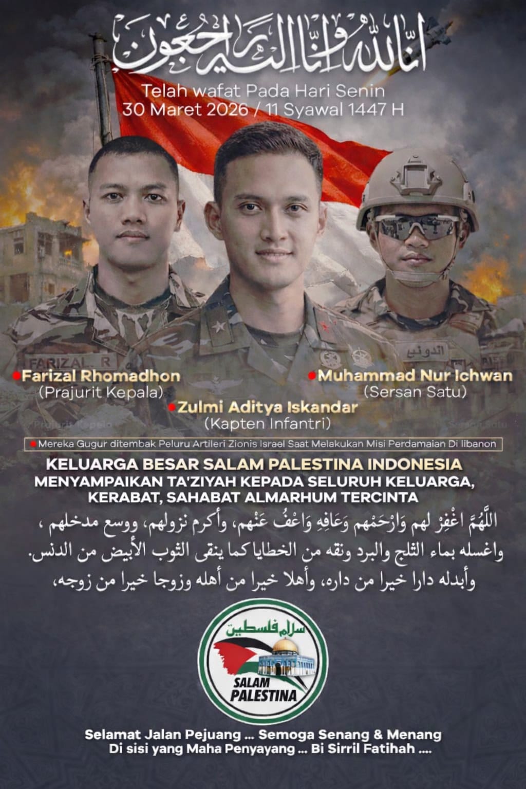 Kabar duka ini menyebutkan tiga prajurit yang gugur yakni Farizal Rhomadhon (Prajurit Kepala), Zulmi Aditya Iskandar (Kapten Infanteri), dan Muhammad Nur Ichwan (Sersan Satu). Mereka dilaporkan meninggal dunia pada Senin, 30 Maret 2026 atau 11 Syawal 1447 Hijriah.