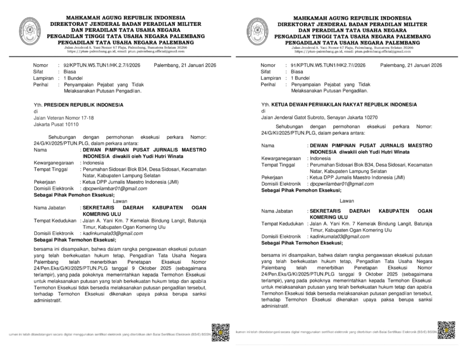 Langkah ini tertuang dalam Surat PTUN Palembang Nomor 92/KPTUN.W5.TUN1/HK.2.7/I/2026 yang ditujukan kepada Presiden Republik Indonesia, serta Surat Nomor 91/KPTUN.W5.TUN1/HK.2.7/I/2026 kepada Ketua DPR RI, tertanggal 21 Januari 2026. Surat tersebut memuat pemberitahuan resmi mengenai pejabat Pemkab OKU yang tidak melaksanakan putusan pengadilan meskipun telah diperintahkan melalui penetapan eksekusi.