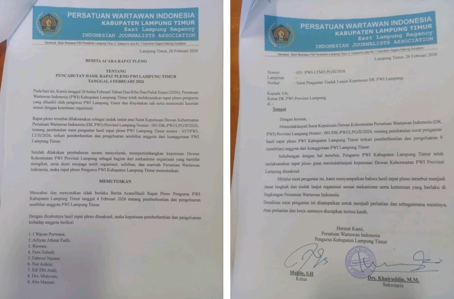 Kemudian pada 26 Februari 2026, pengurus PWI Lampung Timur secara resmi mengeluarkan surat pembatalan pemberhentian sembilan anggota yang sebelumnya dinyatakan dipecat.