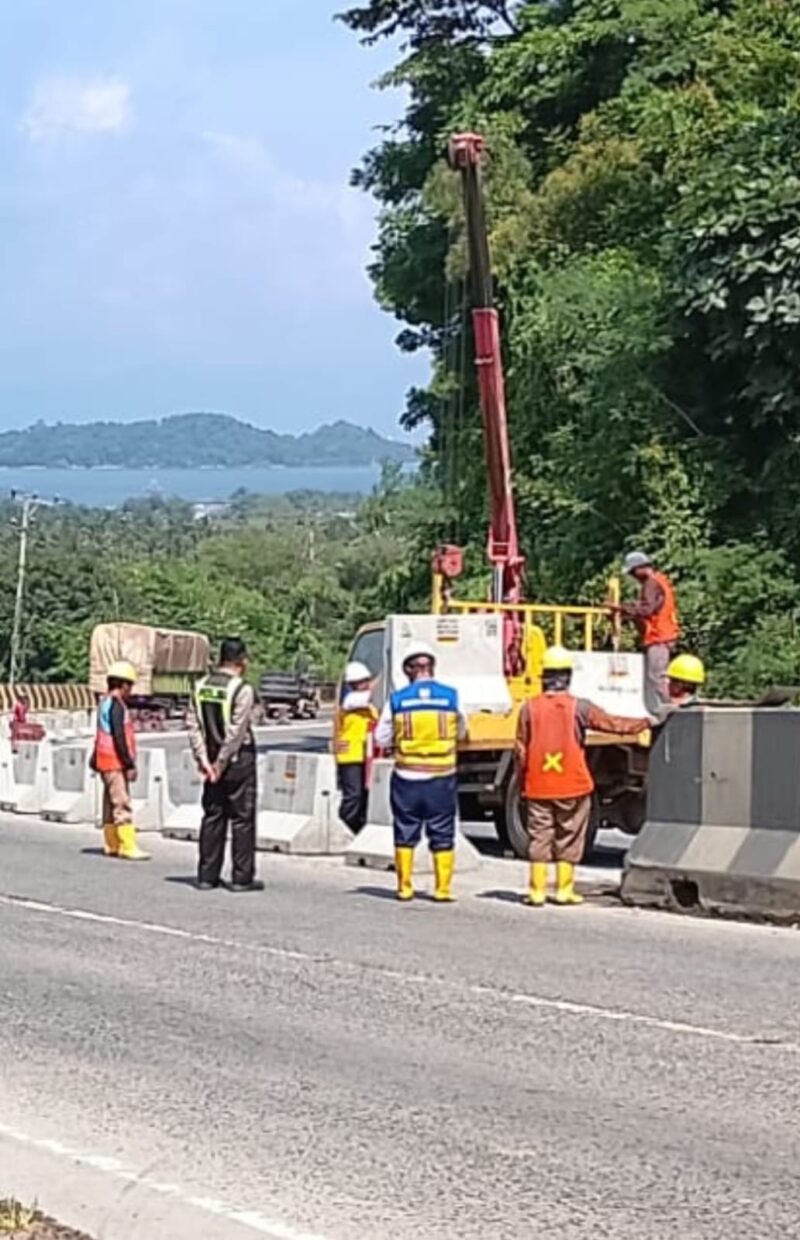 Petugas gabungan terlihat melakukan pemasangan beton pembatas di sepanjang sisi jalan guna mempersempit ruang manuver kendaraan agar lebih terkontrol, sekaligus meminimalisir risiko kendaraan keluar jalur atau tergelincir di area tikungan dan turunan tajam.