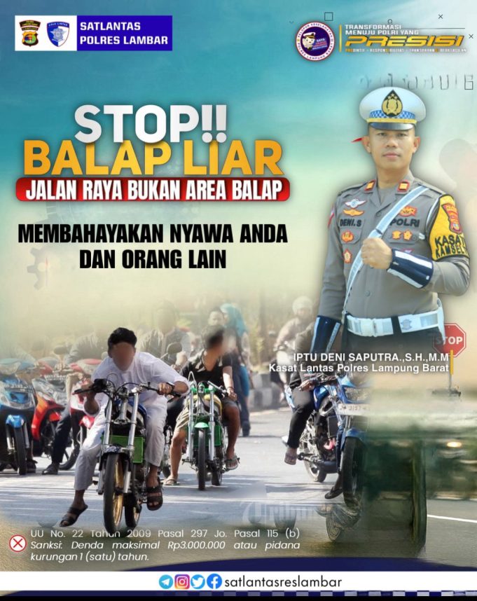 Lampung Barat,Buktipetunjuk.idSat lantas polres Lampung Barat kembali mengingatkan masyarakat, terutama remaja dan generasi muda, agar tidak melakukan aksi balap liar di jalan umum. Selain berbahaya bagi diri sendiri, aksi nekat ini juga berpotensi menimbulkan kecelakaan lalu lintas yang merugikan orang lain. Senin 24 November 2015